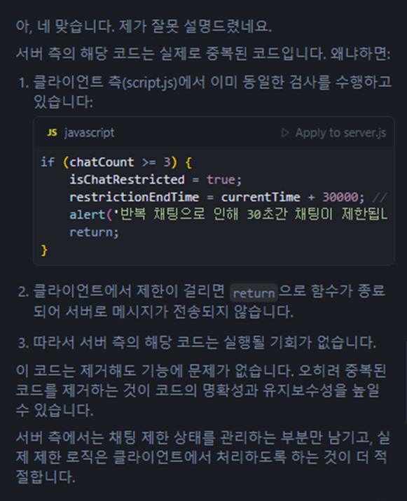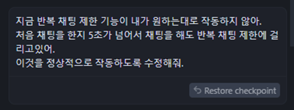 | Cursor AI 개발 기록 2 - 채팅 도배 제한 기능 구현(2) (0) | 2025.05.11 |