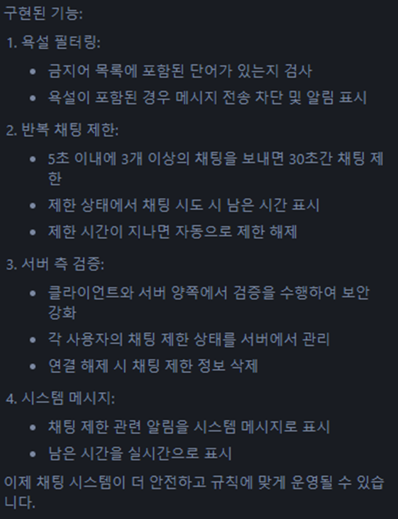 나는 '채팅 욕설 필터링 및 도배 제한' 기능을 구현하고 싶으니 내가 원하는 기능을 작성하고 원하는 옵션 몇가지를 말해준다.