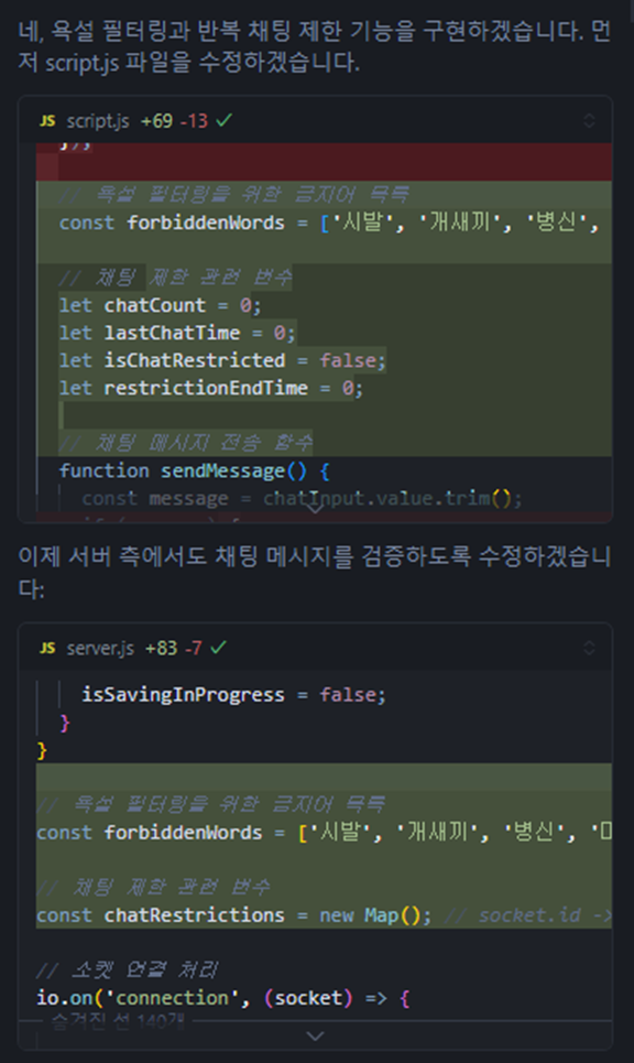 오늘은 Cursor AI 를 통해 채팅 기능 중 '욕설 및 도배 제한 기능'을 구현 요청하고 기록을 남기고자 한다.