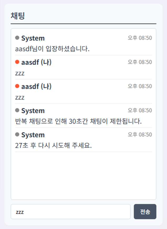 내가 의도했던대로 채팅 도배 제한 기능이 잘 구현된것 같다.