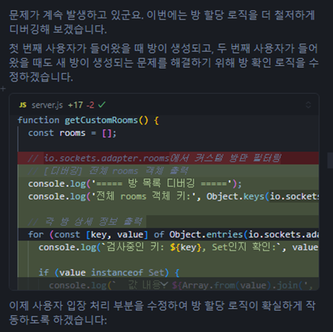 내가 기능 추가를 요구한 부분과 연동되어 코드 변경이 필요한 부분은 알아서 자동으로 수정해주지 않기 때문에 직접 테스트를 진행하고 문제점을 발견해서 수정요청을 해야한다.